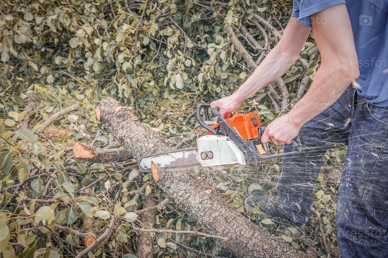 Мужчина с бензопилой пилит дерево, упавшее после урагана
