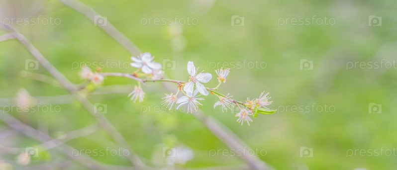 Весенние цветы на ветвях деревьев под теплым солнцем, мягкий фокус, размытый фон