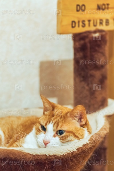 Рыжий кот спит в кошачьем домике с надписью «не беспокоить»