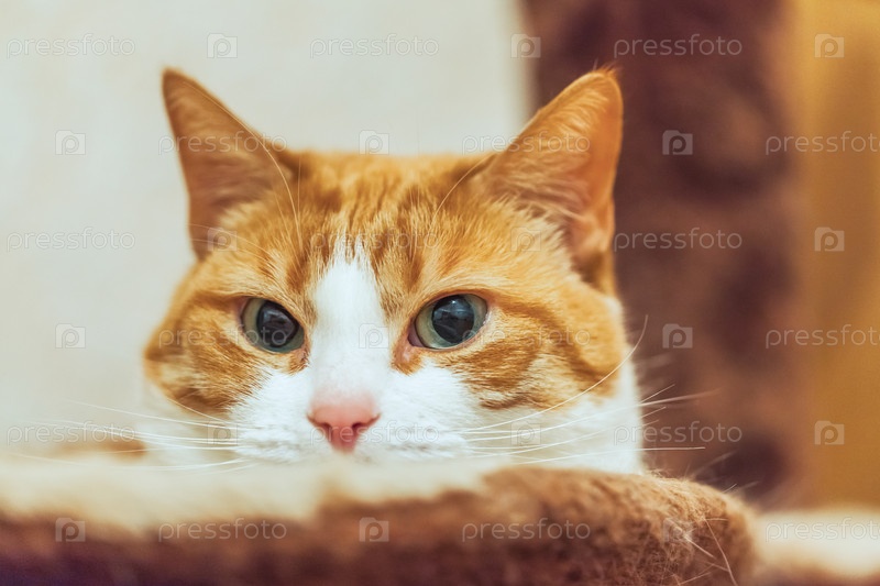 Ленивый рыжий кот лежит в кошачьем домике