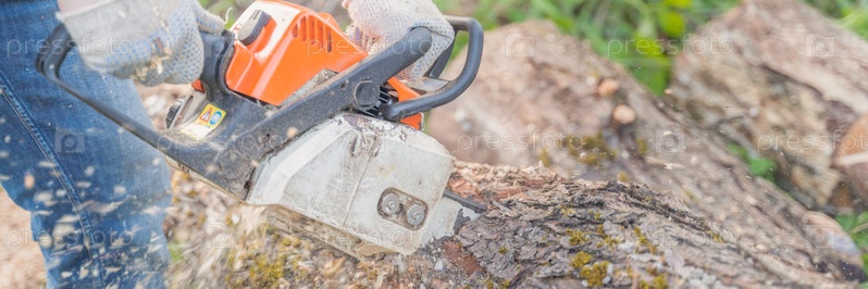 Фермер пилит дерево бензопилой, выборочная фокусировка, фокус на переднем плане, размытый фон