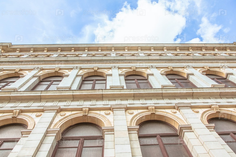Часть старого архитектурного комплекса, голубое небо, белые облака сзади