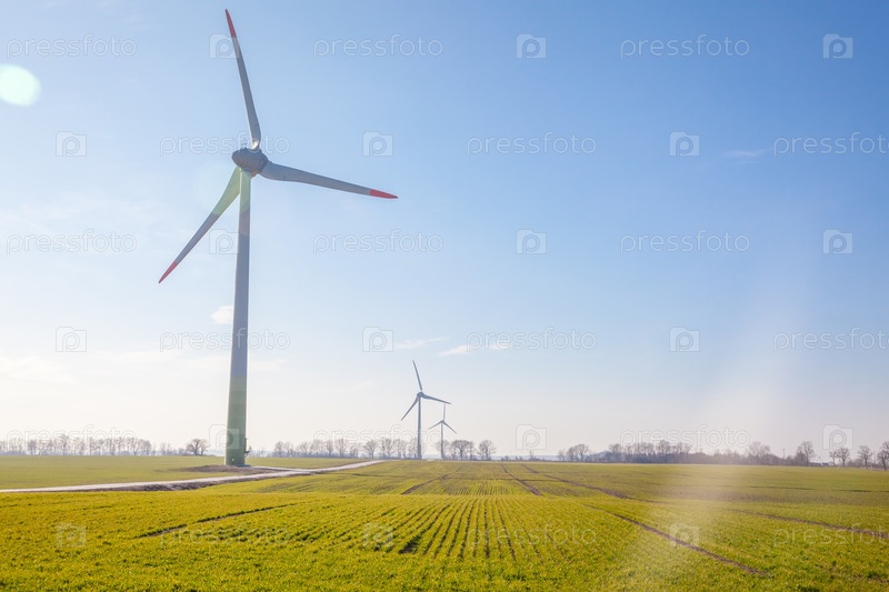Ветряная турбина на зеленом поле с солнечными бликами на фоне голубого неба