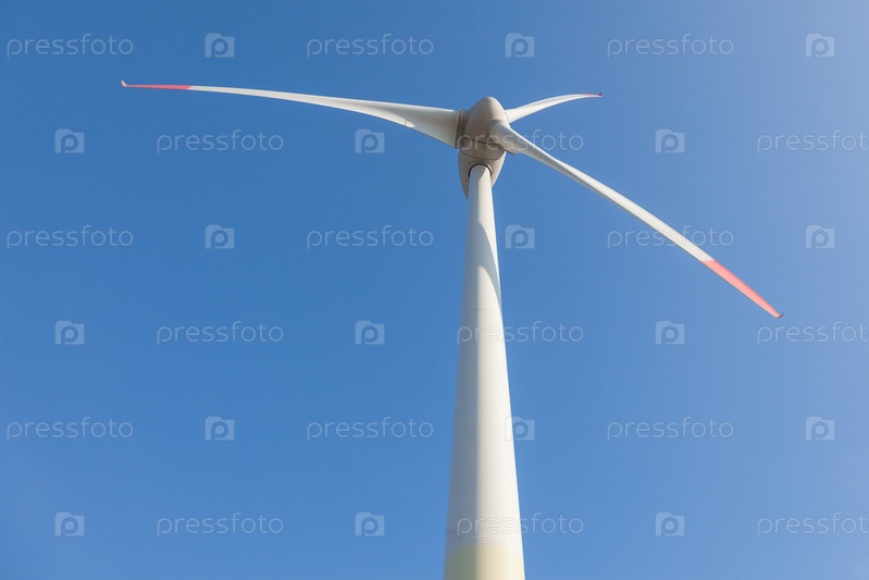 Ветряная турбина с солнечными бликами на фоне голубого неба, вид снизу