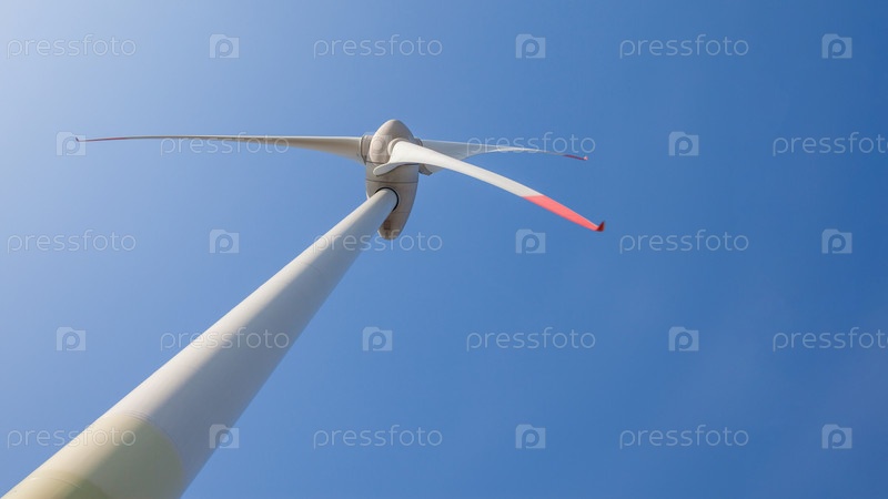 Ветряная турбина с солнечными бликами на фоне голубого неба, вид снизу