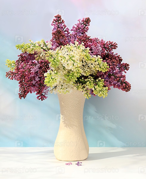 Красивые весенние цветущие ветки сирени в вазе на солнечном фоне. Абстрактная цветочная композиция и баннер для экрана, Натюрморт с местом для текста, Цветочная праздничная открытка