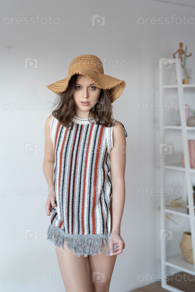 Молодая красивая женщина позирует в коротком платье в студии