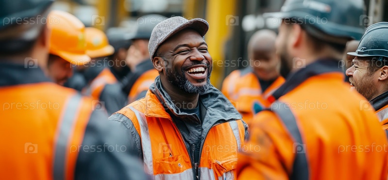 Обсуждение среди строительных рабочих в оранжевой защитной экипировке