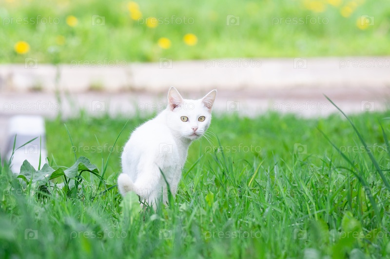 Белый кот в траве