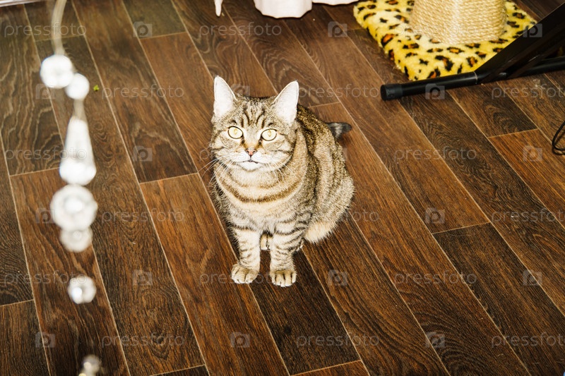 Кошка сидит на полу и смотрит в объектив