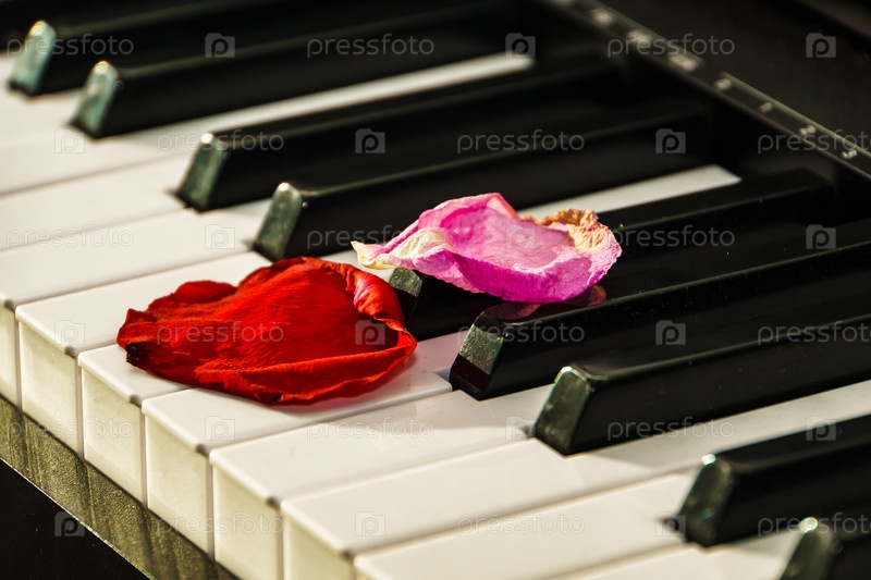 Лепестки роз на клавиатуре фортепиано