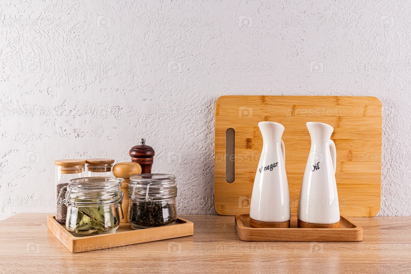 Красивая зона хранения специй в стеклянных банках и масел в керамических специальных бутылочках на деревянной столешнице в кухонном пространстве. Эко-стиль