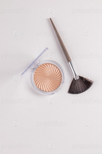 Круглая косметическая упаковка с шикарным хайлайтером естественного блеска. Веерная профессиональная кисть для макияжа. Верхний вертикальный вид. молодость и красота кожи