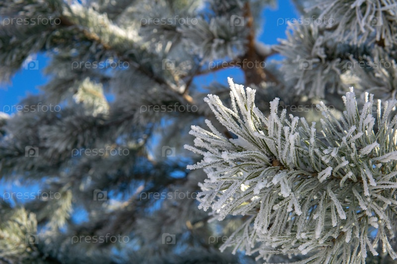 Еловые ветки, покрытые инеем, на фоне голубого неба