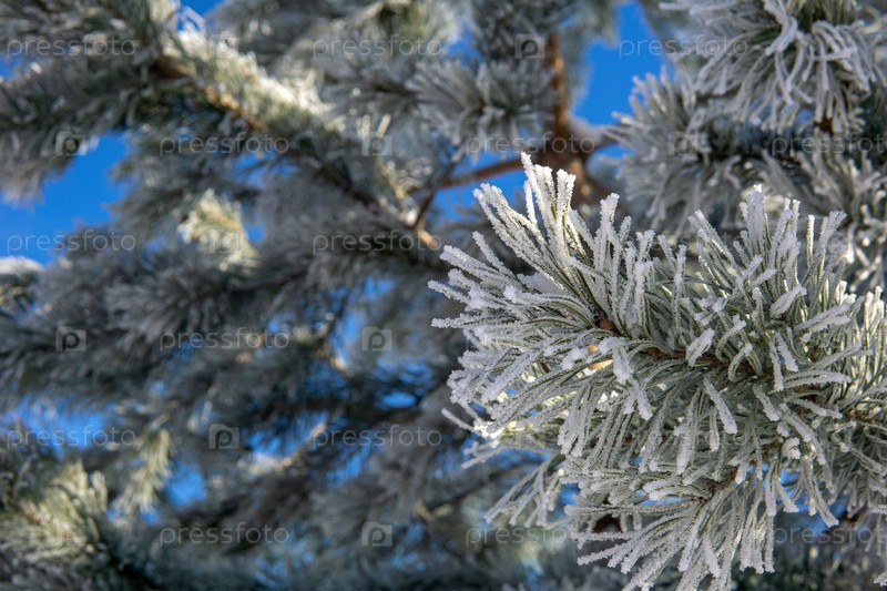 Естественный фон, сосновые ветки в инее на фоне голубого неба