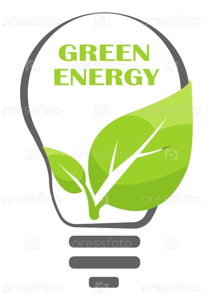 Креативная векторная иллюстрация, представляющая зеленую энергию с лампочкой и зелеными листьями, объединенными в экологическую тему