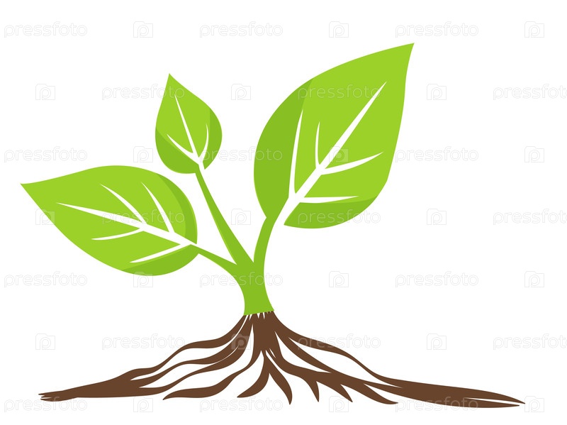 Листовое растение, прорастающее из почвы, с яркими зелеными листьями и корнями в минималистичном стиле