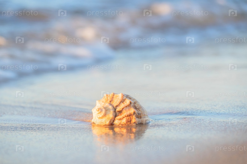 Красивая ракушка лежит на пляже, рядом с лазурной водой моря