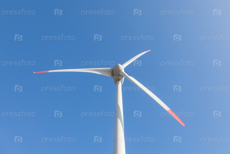 Ветряная турбина с солнечными бликами на фоне голубого неба, вид снизу