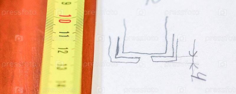Чертеж с расчетами и желтой метрической лентой на столе, крупный план, размытый фон