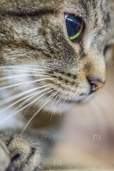Морда полосатой кошки с большими глазами, крупный план, мягкий фокус