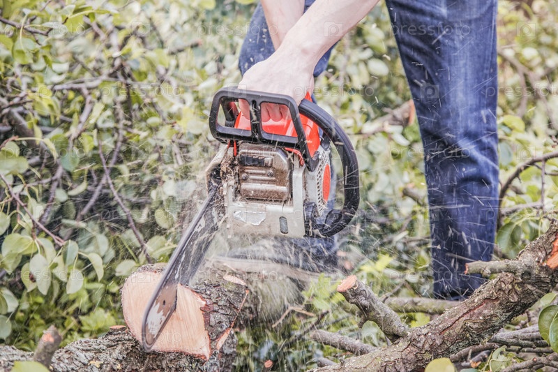 Мужчина с бензопилой пилит дерево, упавшее после урагана