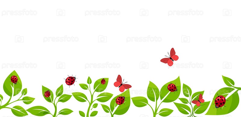 Красочные векторные иллюстрации растений, божьих коровок и бабочек в ярком саду