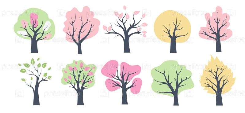 Исследуйте яркие изменения деревьев весной с красочными цветами на иллюстрациях в стиле плоского дизайна