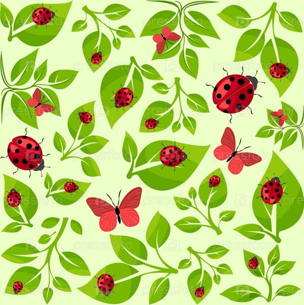 Красочные векторные иллюстрации божьих коровок и бабочек среди зеленых листьев в живом, естественном дизайне. Бесшовный узор