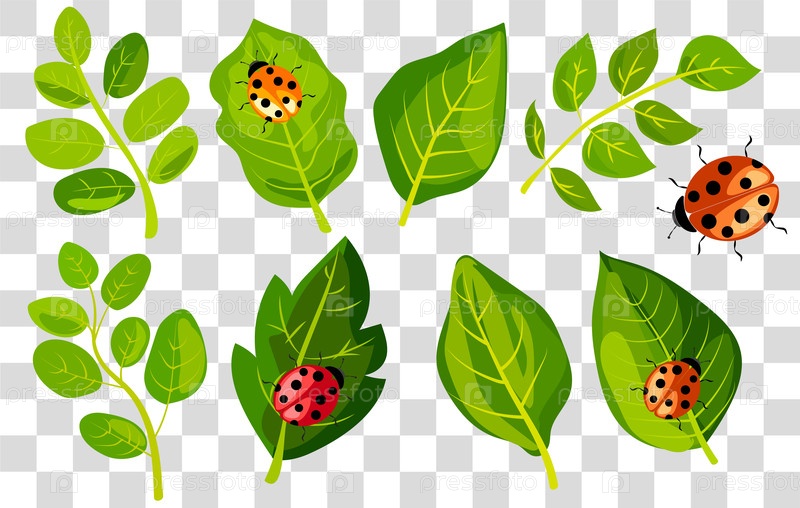 Красочная векторная иллюстрация свежих зеленых листьев с игривыми божьими коровками на прозрачном фоне