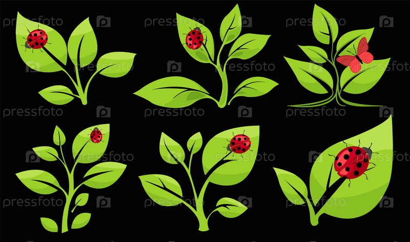 Красочные векторные иллюстрации божьих коровок и бабочек на зеленых листьях с темным фоном