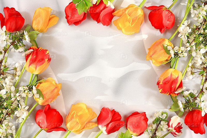 Цветочная праздничная открытка с концепцией летнего приветствия. Абстрактная цветочная композиция с красивыми весенними цветущими тюльпанами и ветками цветущей вишни на элегантном солнечном фоне. Натюрморт
