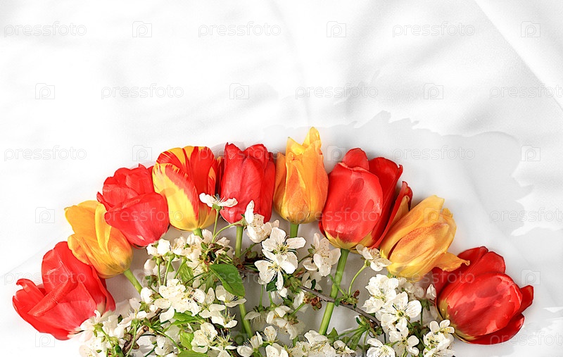 Абстрактная цветочная композиция с красивыми весенними цветущими тюльпанами и ветками вишни на элегантном солнечном фоне. Натюрморт с местом для текста, Цветочная праздничная открытка с концепцией летнего приветствия,