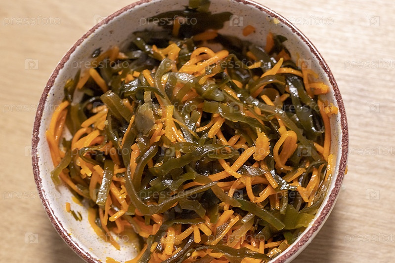Крупным планом салат из моркови и водорослей в глиняной чаше. Еда