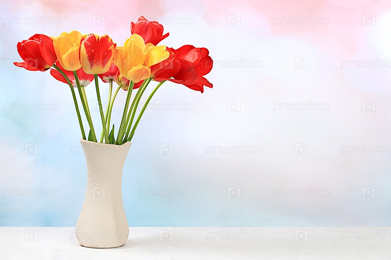 Красивые весенние цветущие тюльпаны в вазе на элегантном фоне. Абстрактная цветочная композиция и баннер для экрана, Натюрморт с местом для текста, Цветочная праздничная открытка с концепцией летнего приветствия