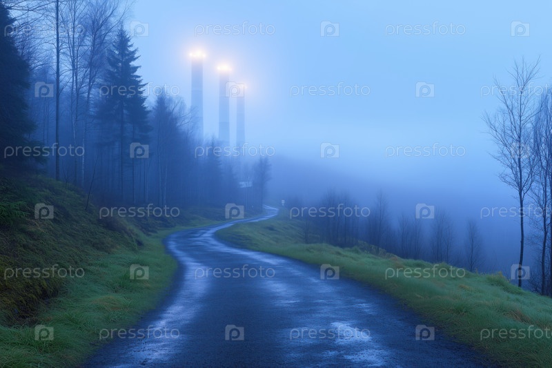 Дорога в туманном лесу с промышленными трубами на переднем плане