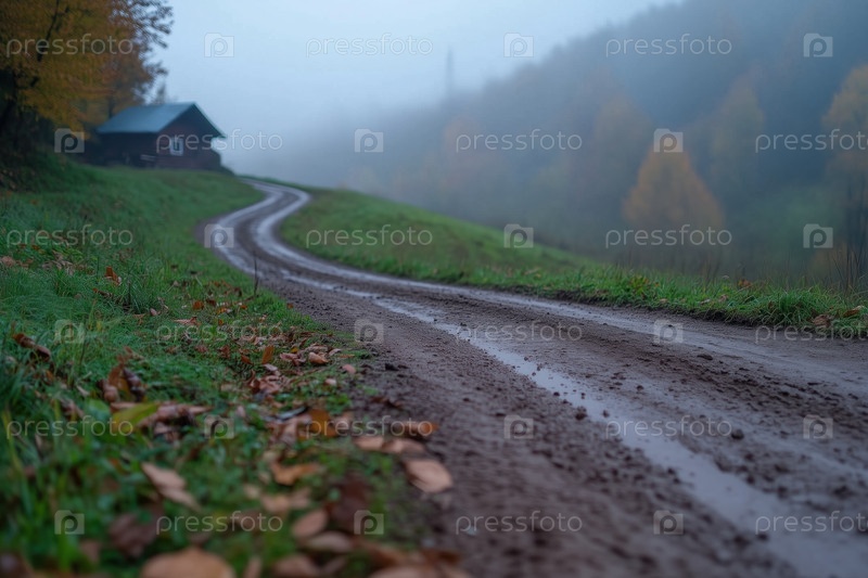 Осенний пейзаж с грунтовой дорогой и старым деревянным домом в тумане