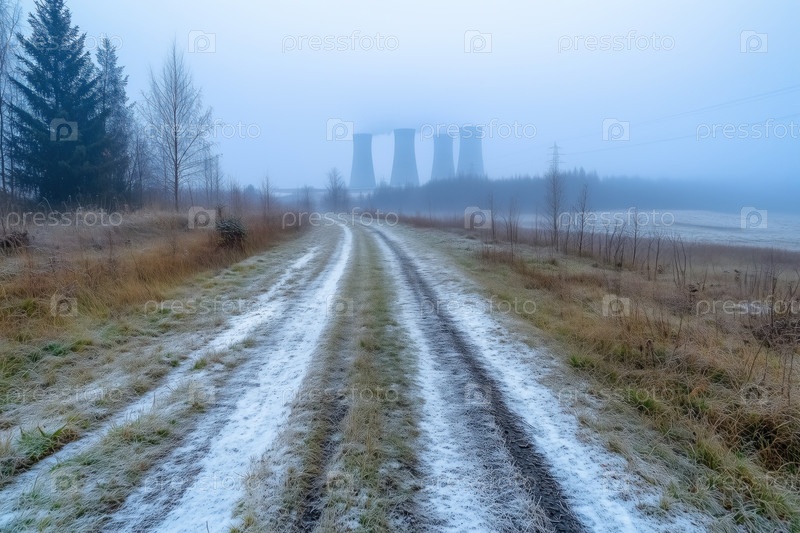 Туманная сельская дорога зимой с электростанцией на заднем плане