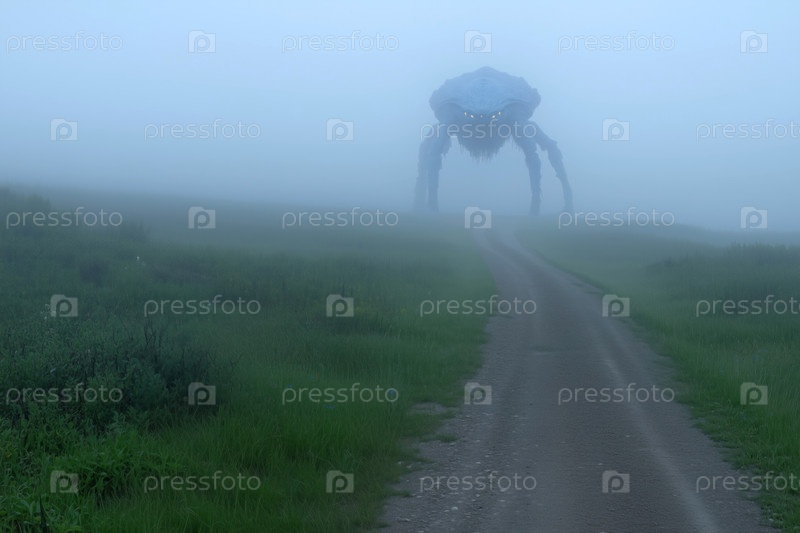 Туманная дорога на лугу с огромным инопланетным монстром на заднем плане