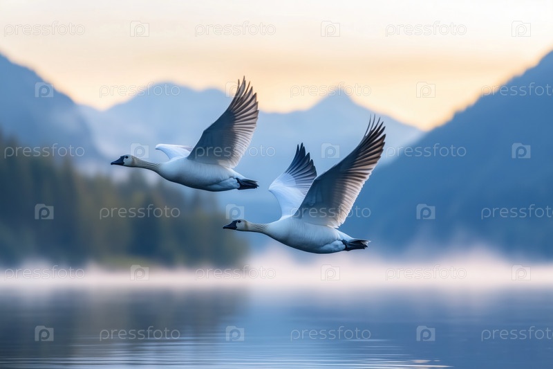Два диких гуся летят над озером на рассвете