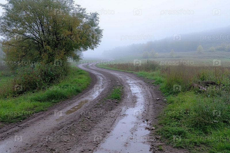 Грунтовая дорога на туманном лугу ранним утром