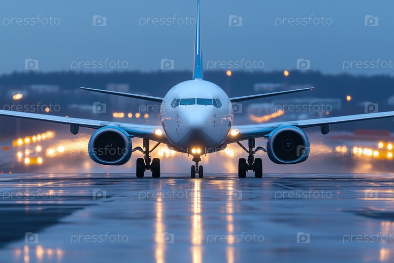 Самолет на взлетно-посадочной полосе в аэропорту ночью