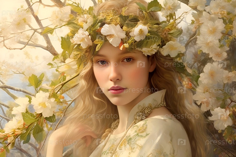 Красивая светловолосая девушка, королева Весны в цветочном венке. Лесная фея среди цветущих деревьев. Портрет молодой женщины с пронзительным взглядомпронзительный взгляд