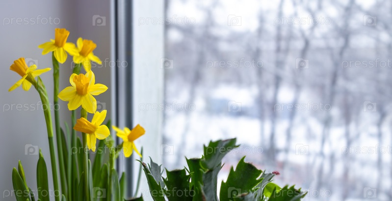 Желтые нарциссы ранней весной у окна на фоне тающего снега в городе. Женский день, первые цветы. Баннер, место для текста