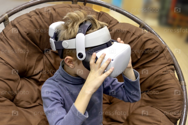 Мальчик в гарнитуре виртуальной реальности играет в удобном кресле
