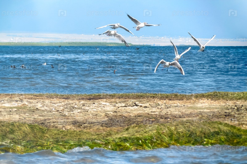 Чайки кружат над мелководьем. Живописная бирюзовая вода. Копировать пространство