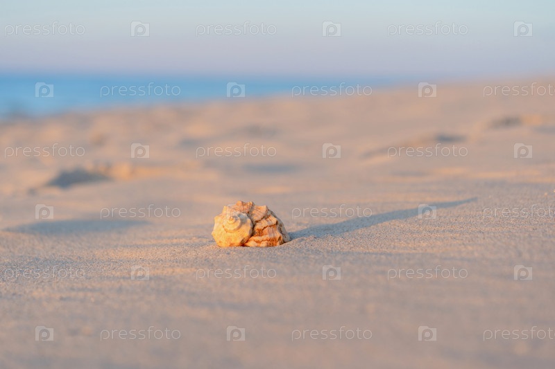 Красивая ракушка лежит на пляже, рядом с лазурной водой моря
