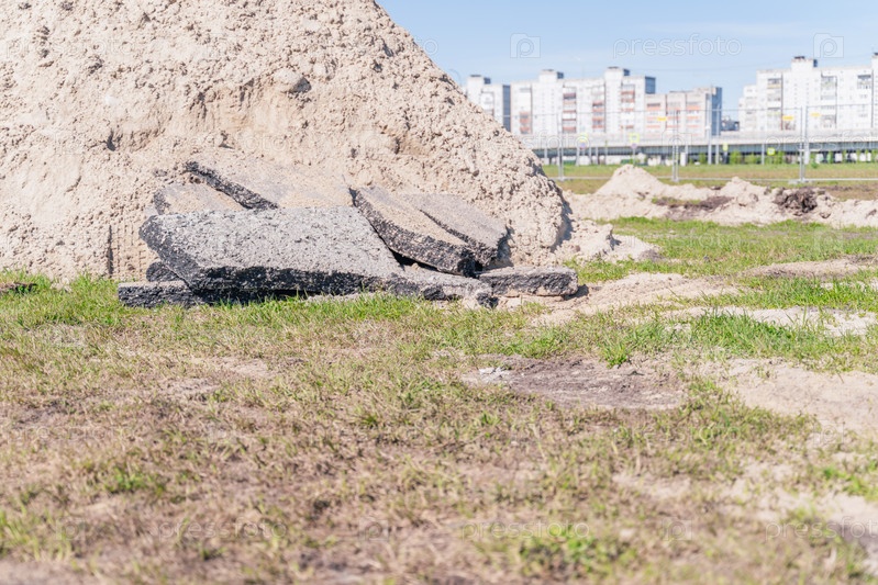 Строительные работы в городе, большая куча земли, городской пейзаж на заднем плане