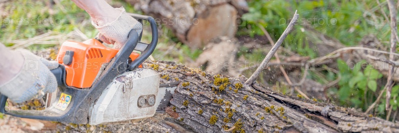 Фермер пилит дерево бензопилой, выборочная фокусировка, фокус на переднем плане, размытый фон