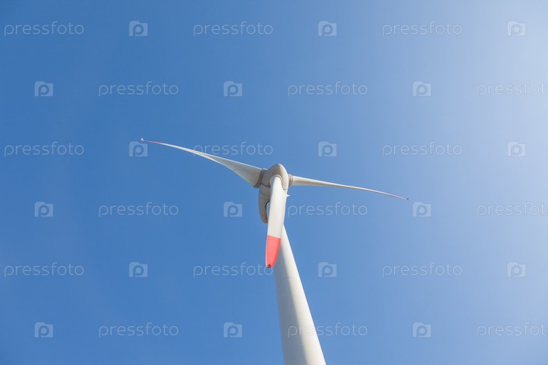 Ветряная турбина с солнечными бликами на фоне голубого неба, вид снизу
